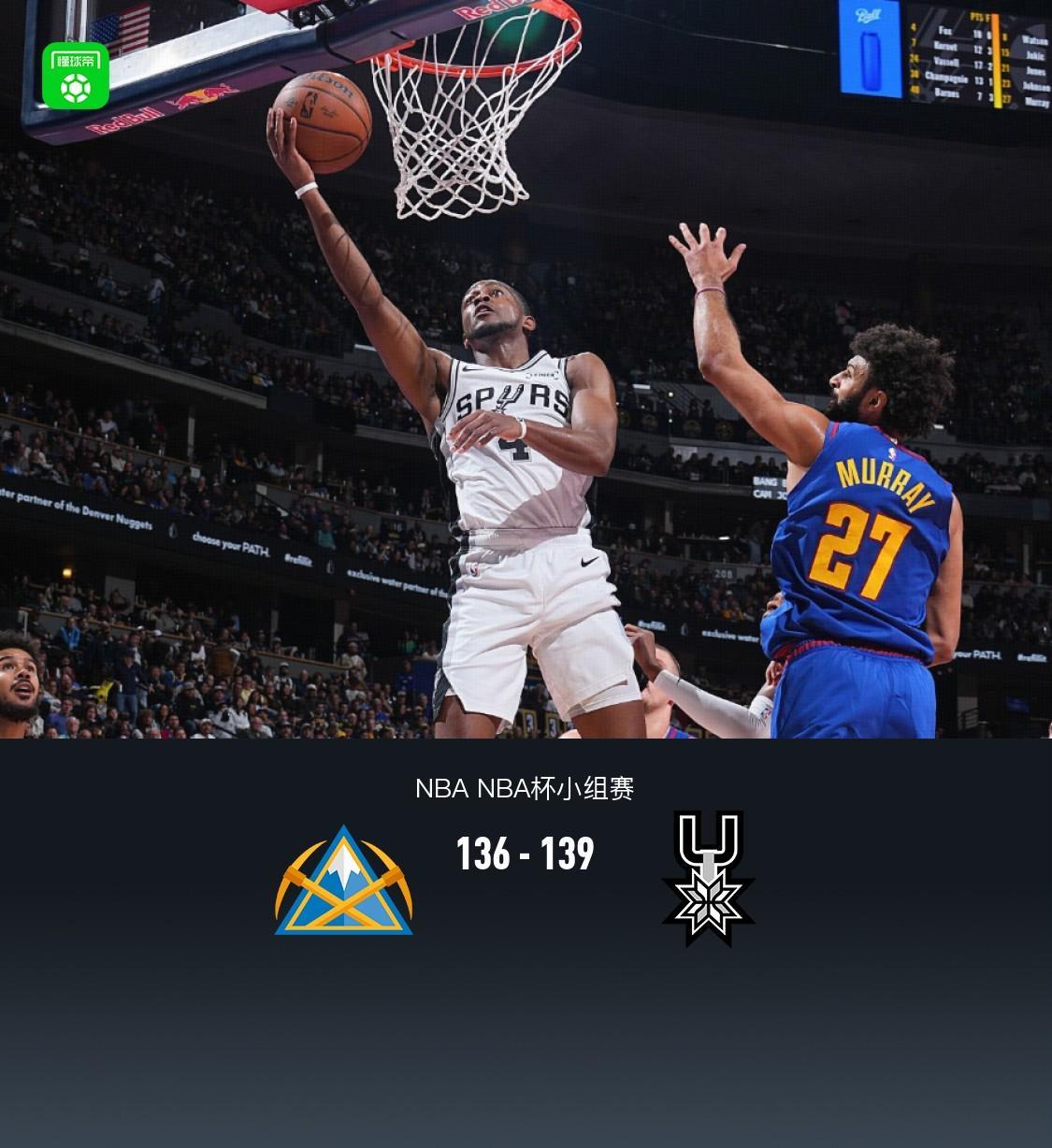 北京時間11月29日NBA NBA杯小組賽,丹佛掘金對陣圣安東尼奧馬刺。半場掘金74-59馬刺,最終掘金136-139馬刺。丹佛掘金賈馬爾-穆雷37分4板7助,卡梅隆-約翰遜28分6板1助;圣安東尼奧馬刺瓦塞爾35分3板2助,尚帕尼25分10板2助。