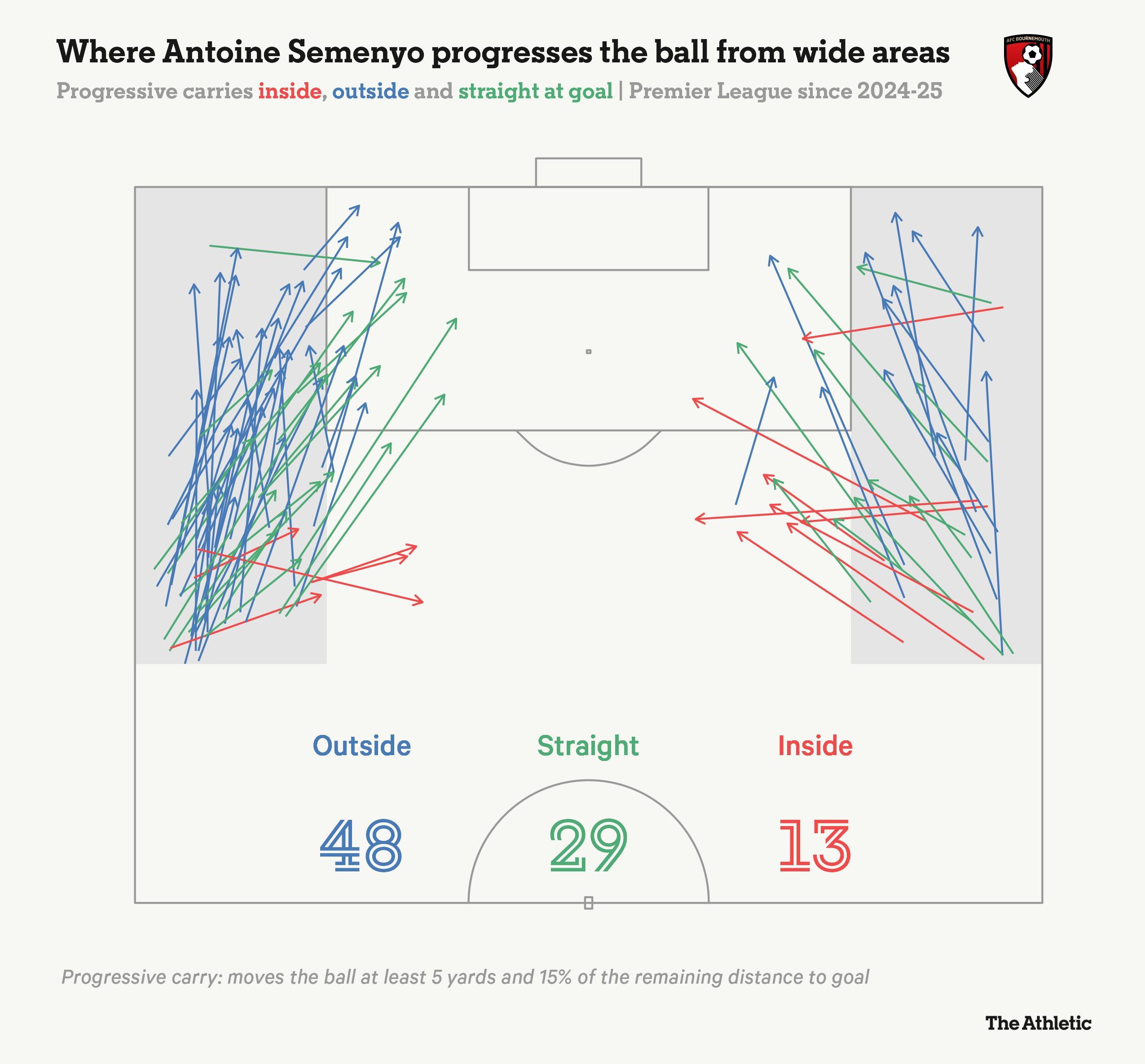 他并不以伯恩茅斯另一名邊鋒希門尼斯(在老特拉福德踢另一側(cè)邊路)那種方式深度回防,但這部分是由于戰(zhàn)術(shù)指示,因?yàn)椴髅┧沟暮芏啻蚍ǘ紘@在奪回球權(quán)后將球傳給處于空當(dāng)?shù)娜T約展開。