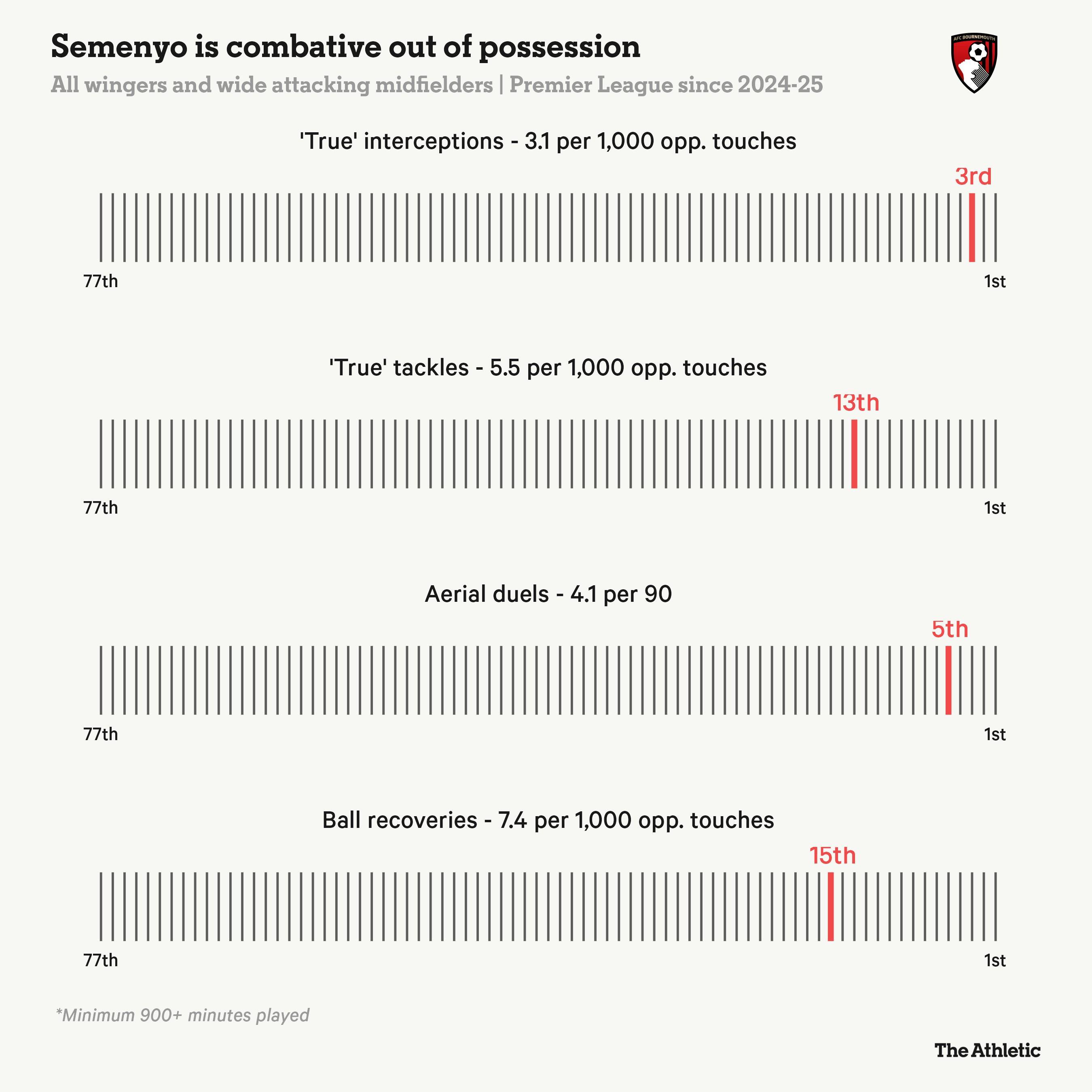 在防守方面,與許多英超頂級(jí)邊鋒相比,他在無球跑動(dòng)和壓迫時(shí)的表現(xiàn)也相當(dāng)出色。作為伊勞拉麾下高位壓迫體系的一部分,塞門約更像是一個(gè)主動(dòng)出擊型的防守者,旨在從觸球過重或靠近己方禁區(qū)時(shí)未觀察周圍情況的對(duì)手腳下斷球。