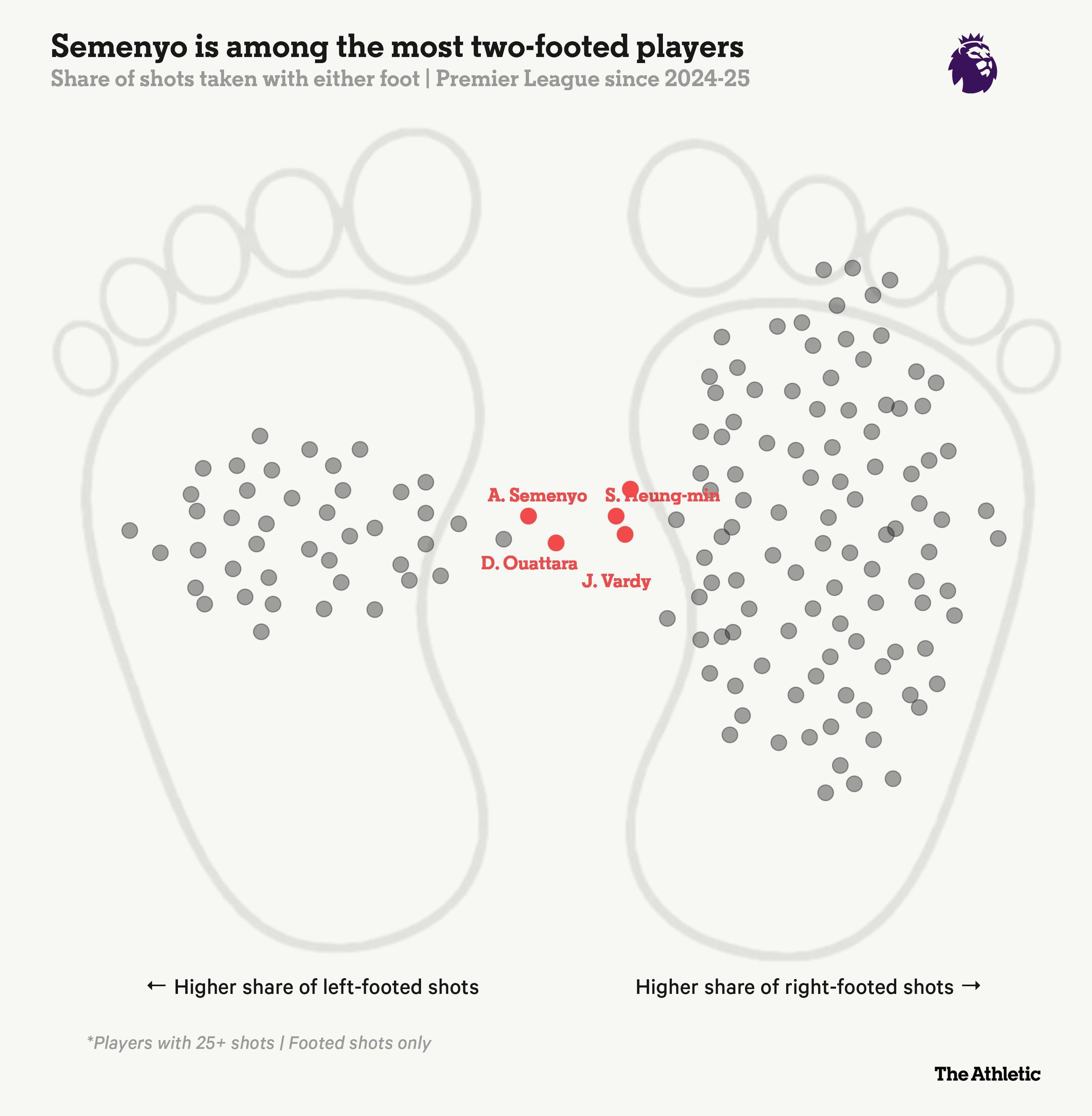 由于他的雙腳均衡能力,對(duì)手的防守變得更加復(fù)雜。如果我們觀察自2024-25賽季以來球員的射門腳分布,塞門約可能是聯(lián)賽中最“雙足皆能”的球員。
